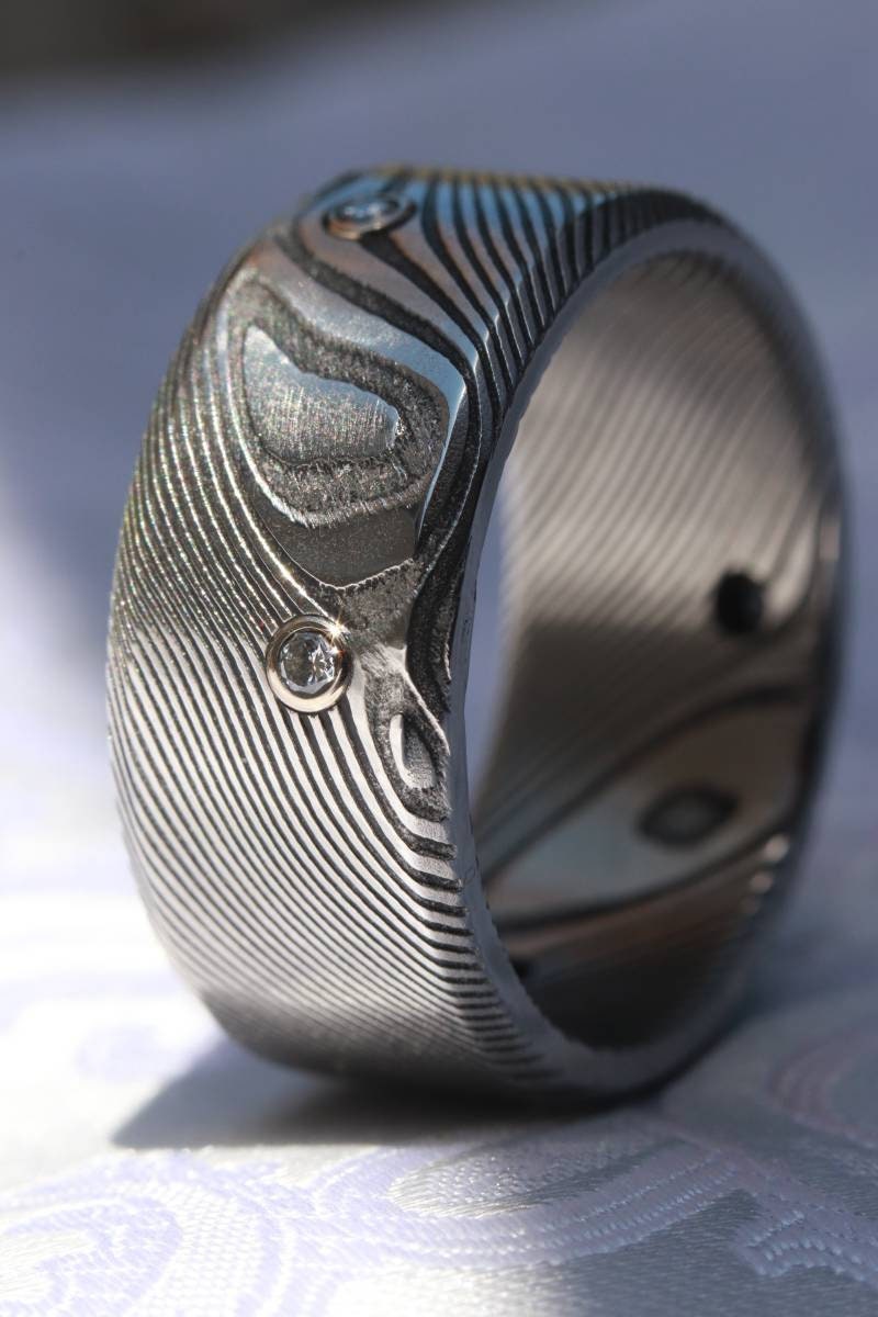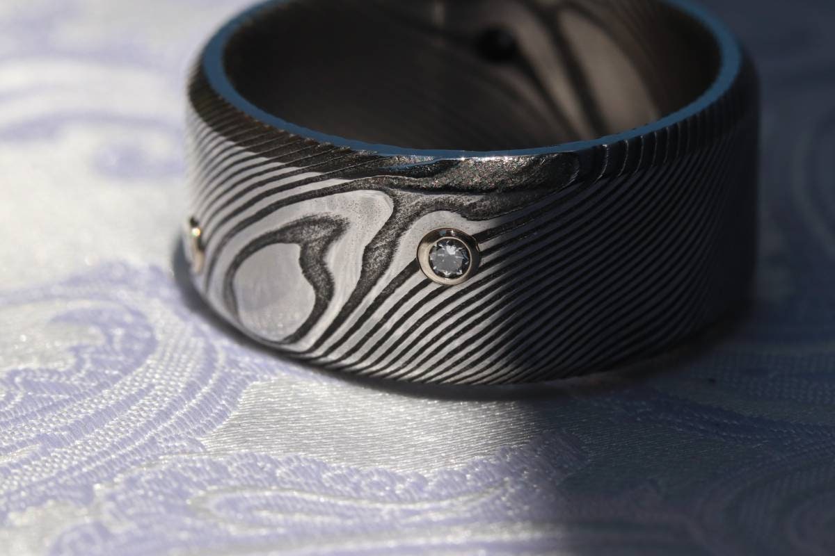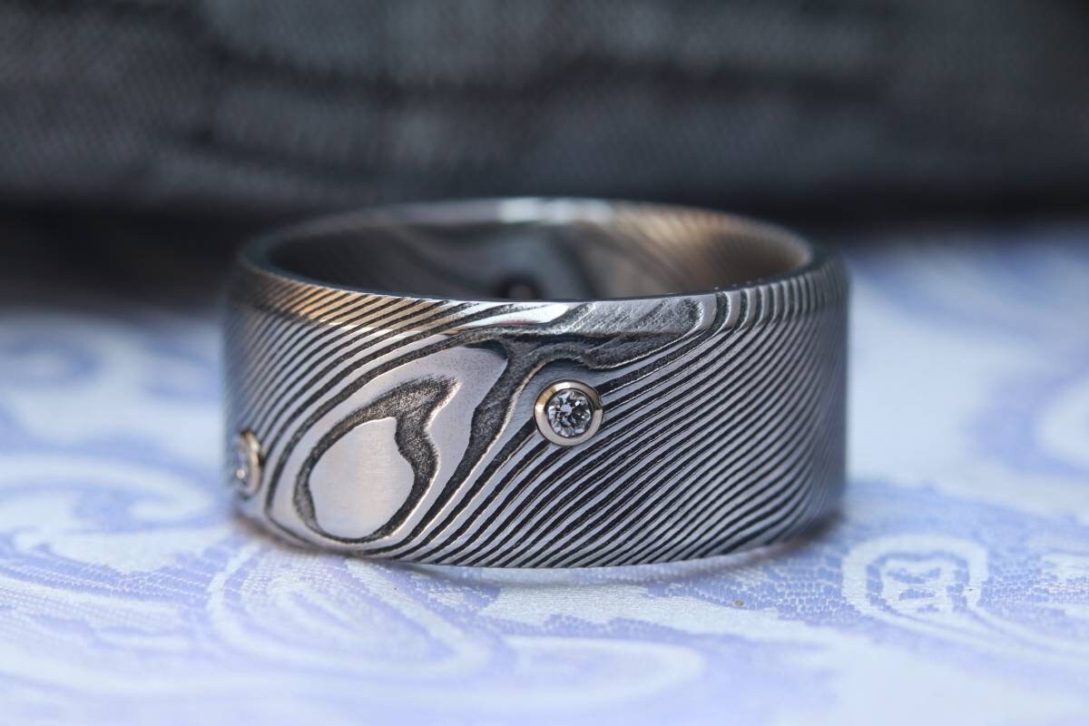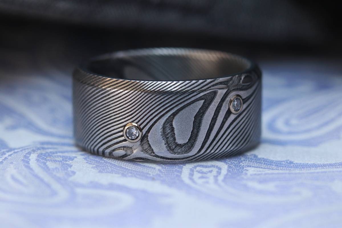 damasteel ring 10mm wide / 4 diamonds 14k gold customizable mens ring wave pattern