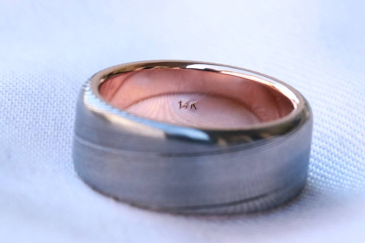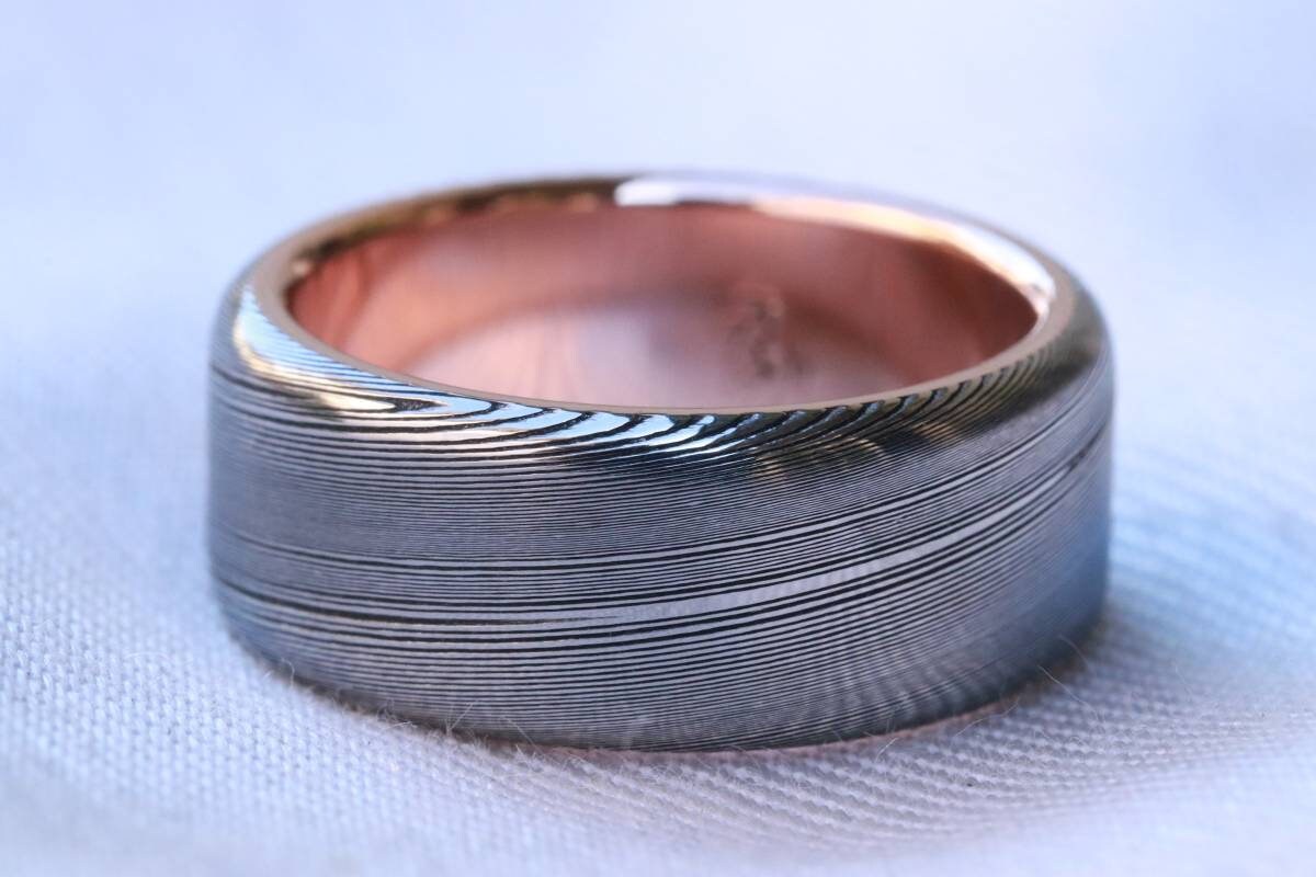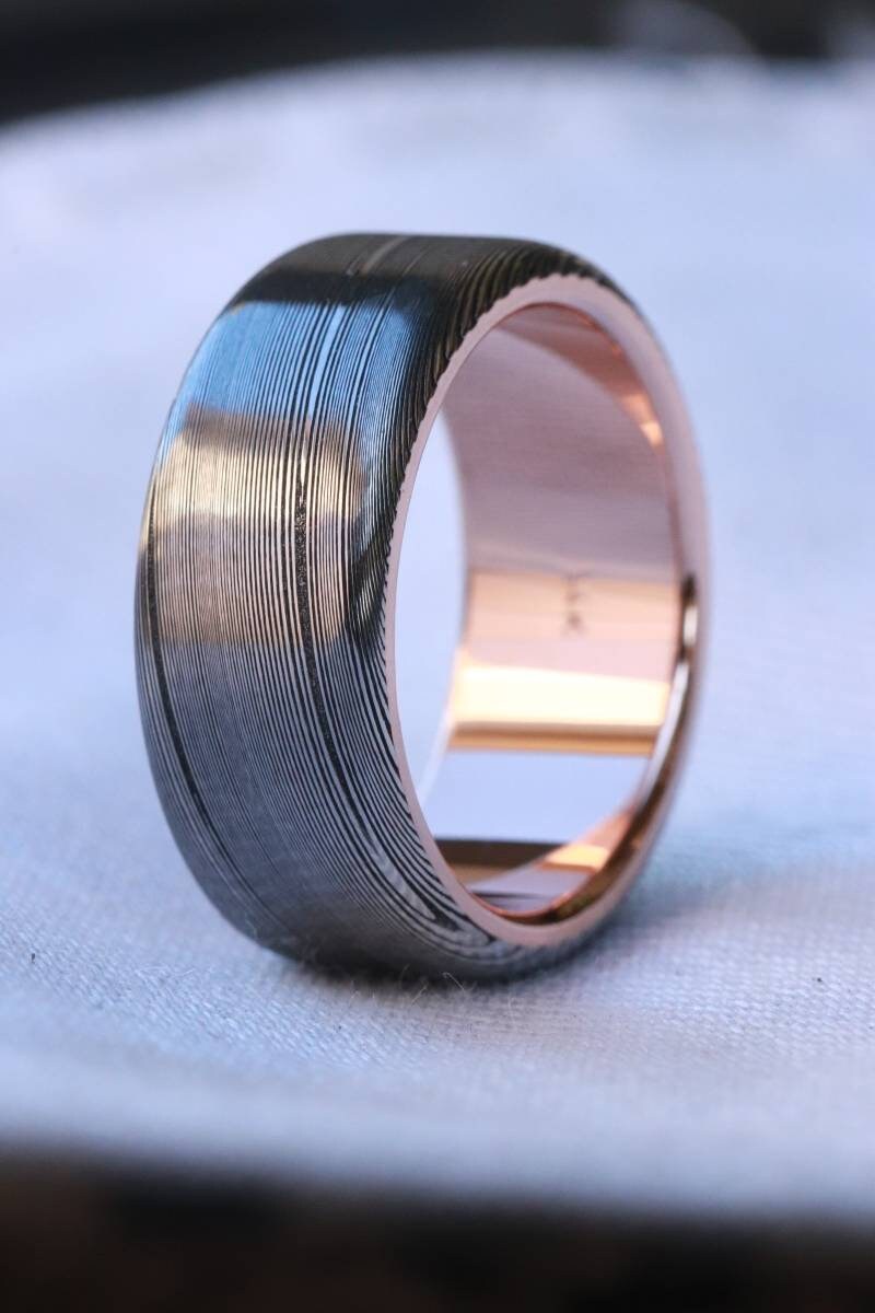 LIMITED EDITION 8mm Damascus ring 14k rose Gold & Stainless Damascus steel "wood-grain" ( customizable)