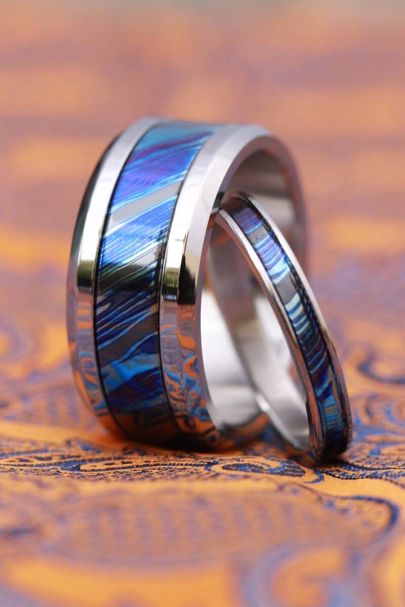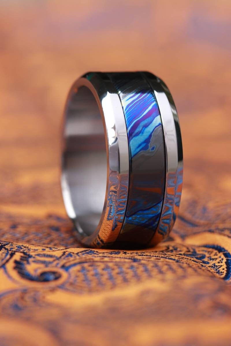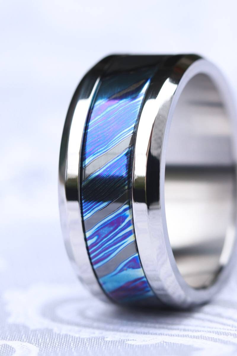 Blue Series handmade. The ring measures 10.5mm wide with a 3 piece design. (Timascus/ZrTi inlay and polished titanium inside and on the rails. The width can be altered up to your discretion. Everything is handmade and the patterns and colors from the damascus and timascus will vary slightly. This ring cannot be altered due to the 3 piece design once the purchase has been made and the creating process has begun. Thank you for your business, Josh This ring can also be found on JBlunt Design's website at https://www.jbluntdesigns.com.